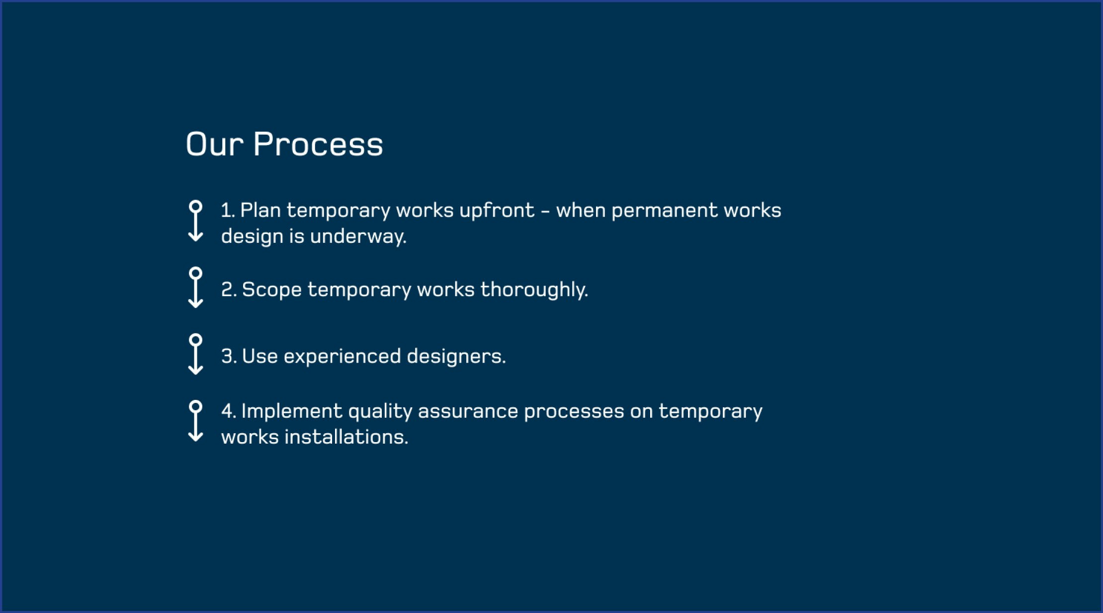 Approval for temporary works can potentially be a lengthy process, so plan early to avoid delays on your project and ensure your client’s requirements are well understood. Importantly, don’t forget to review the design assumptions and establish quality assurance (QA) of temporary works. QA documentations, routine inspections and maintenance are critically important to avoid oversights and worksite incidents.